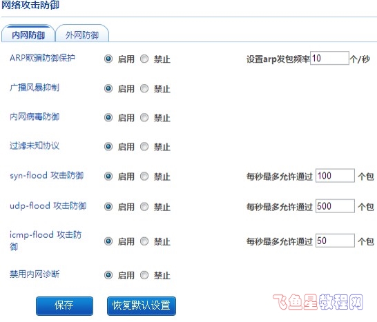 本界面提供全新网络自防御体系配置。飞鱼星网络自防御机制能够侦测及阻挡ARP欺骗,源路由攻击,IP端口扫描,DoS等网络攻击,可以有效防止多种病毒 攻击。即使内网存在恶意流量,飞鱼星独有的“网络自防御”技术也可以杜绝整个网络的瘫痪,以保证其他主机浏览网页、聊天、游戏等的正常应用,确保网络整体 的正常运营。